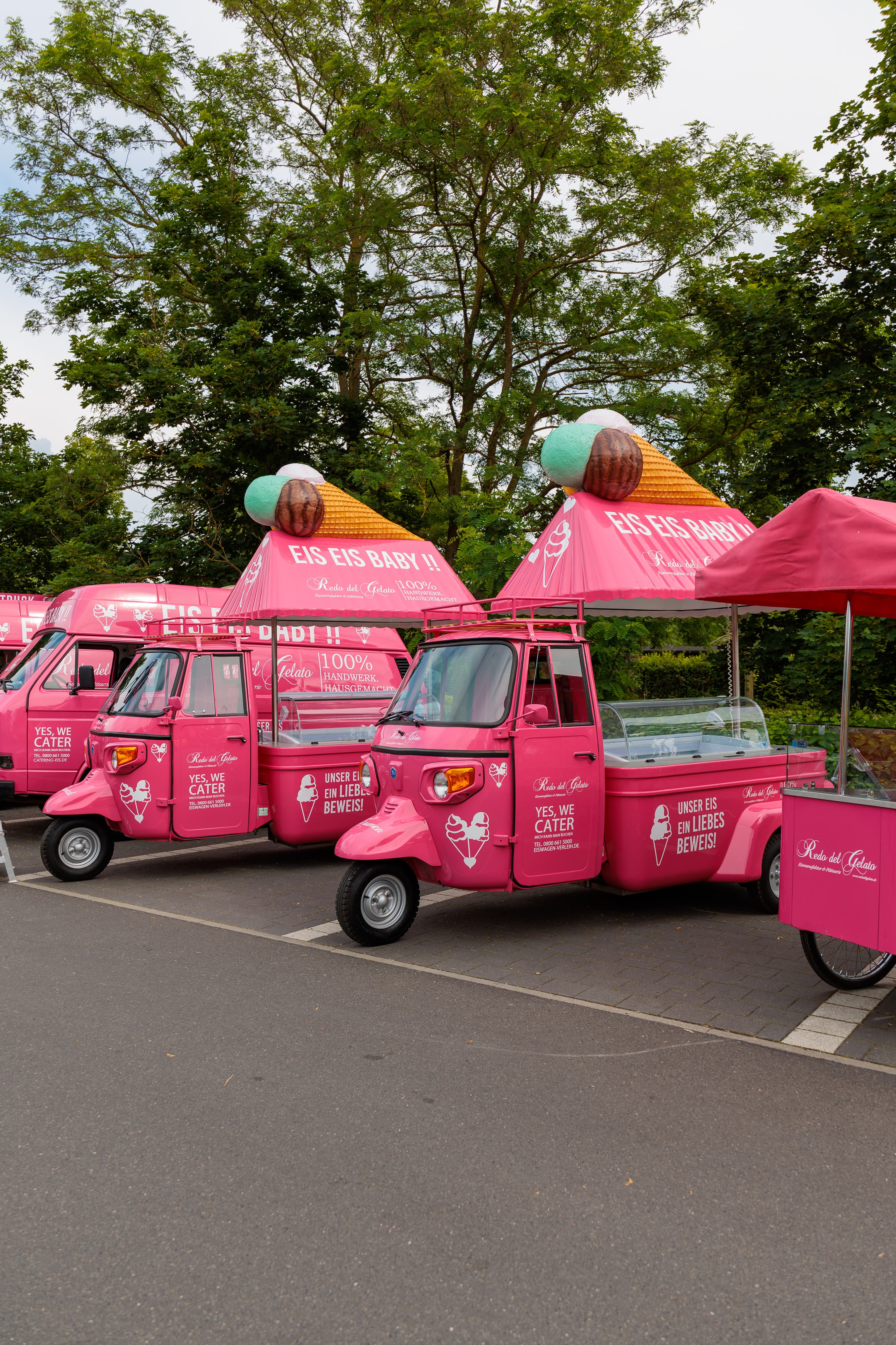 Vom kompakten Lastenrad für Indoor Events über die ikonische pinke Piaggio Ape und den Kult Bulli bis hin zum großen Premium Anhänger und unserem liebevoll restaurierten historischen Eiswagen. Jeder Wagen ist autark unterwegs, professionell besetzt und in unserem Hausdesign auffällig pink lackiert.